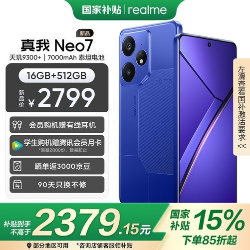 [活动福利]realmeNeo7手机大促来袭!国补15%,最高补贴500元,下单仅需2379.15元即可入手。这款手机自发布以来备受瞩目,其精致的外观设计和出色的性能表现吸引了众多消费者的青睐。